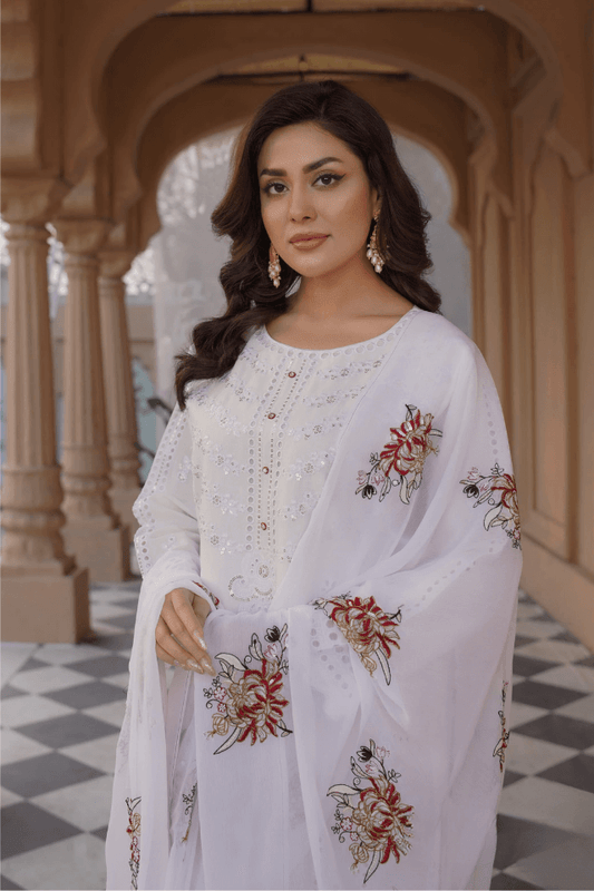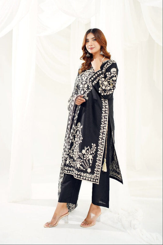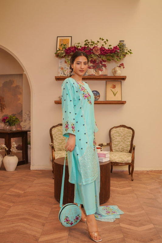 3 Piece Stitched Embroidered Lawn Suit with Embroidered Soft Organza Dupatta