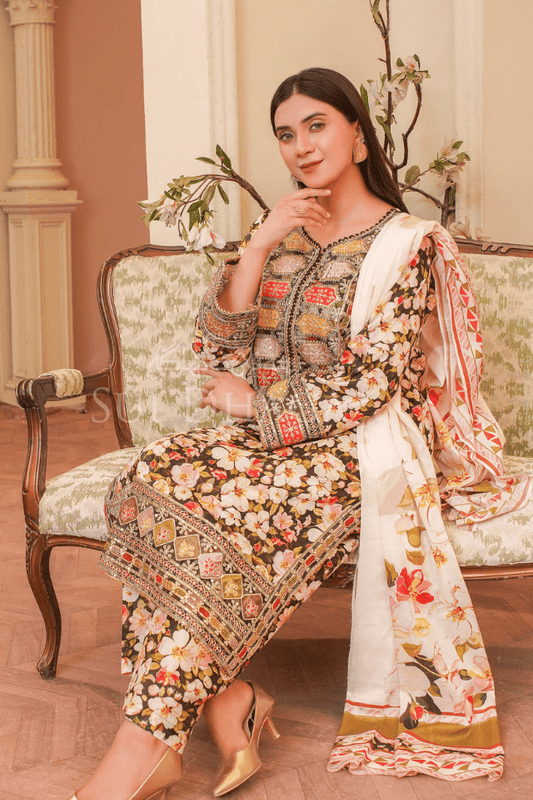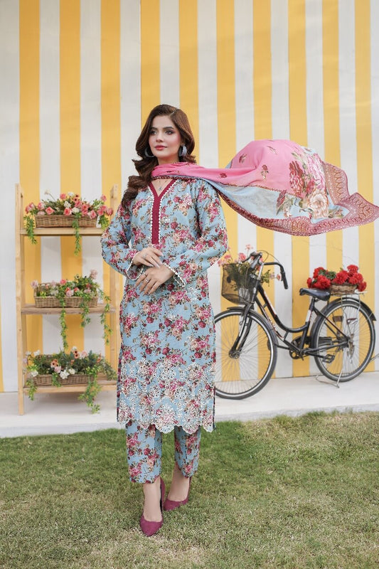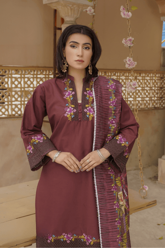 3 Piece Stitched Embroidered Lawn Suit with Printed Lawn Dupatta