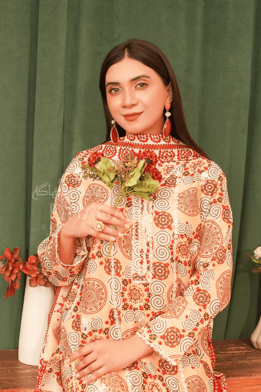 3 Piece Stitched Embroidered Lawn Frok with Printed Monaar Chiffon Dupatta