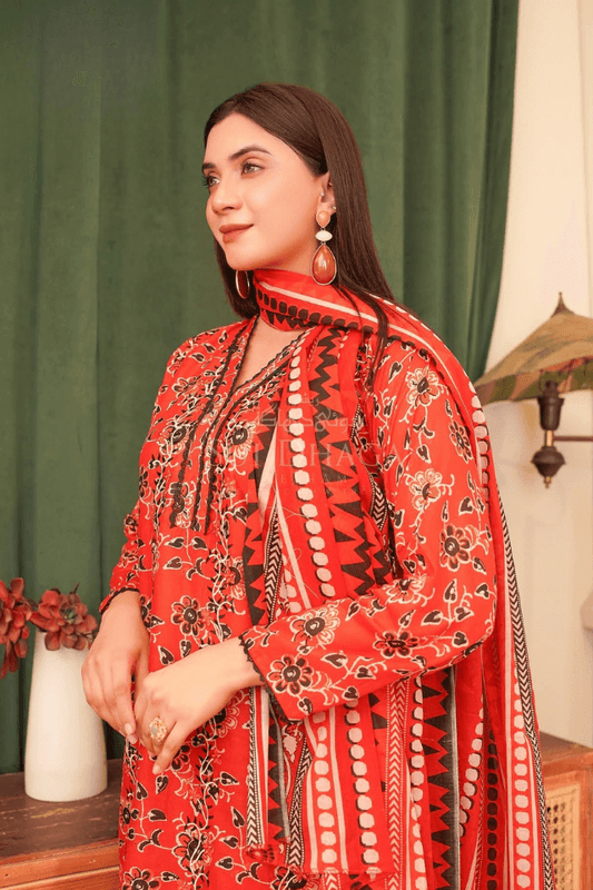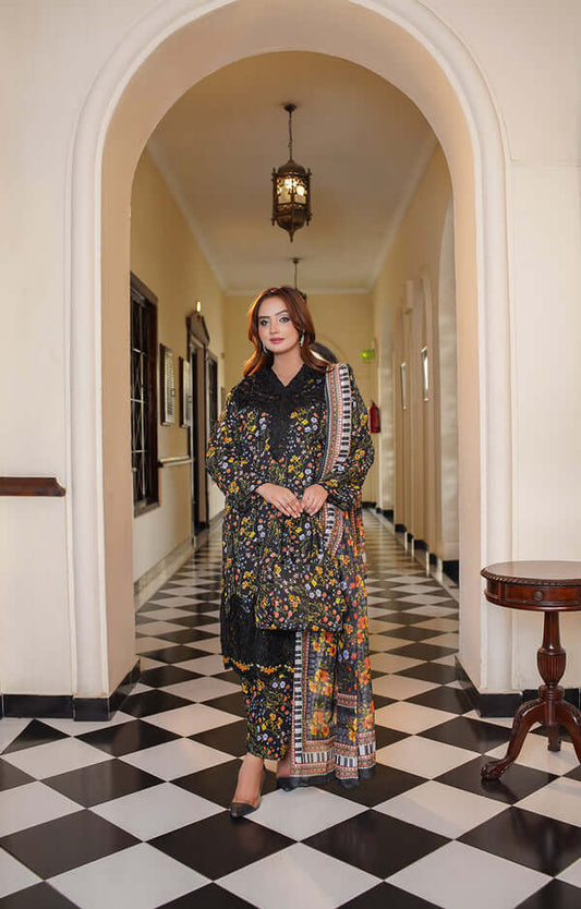 3 Piece Stitched Embroidered Lawn Suit with Printed Monaar Chiffon Dupatta