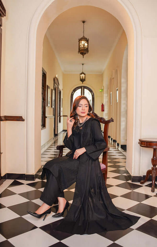 3 Piece Stitched Embroidered Lawn Suit with Printed Monaar Chiffon Dupatta and Jacket