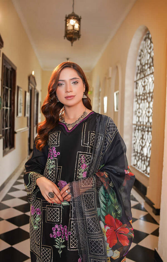3 Piece Stitched Embroidered Lawn Suit with Embroidered Soft Organza Dupatta