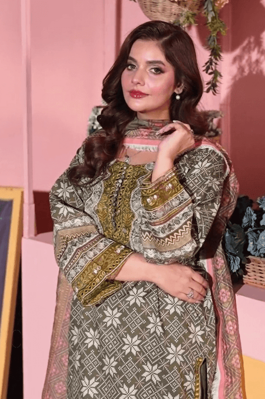 3 Piece Stitched Embroidered Lawn Suit with Printed Lawn Dupatta